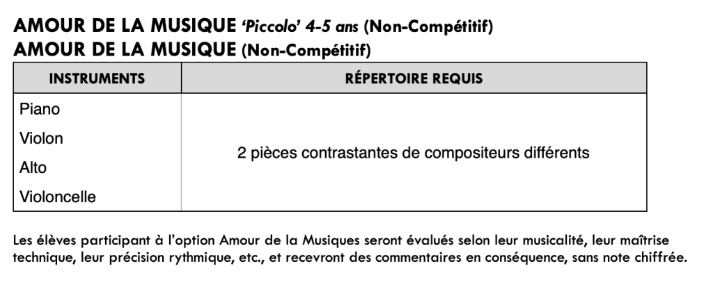 Amour de la Musique ‘Piccolo’ (non-compétitif) âge : 4 et 5 ans*