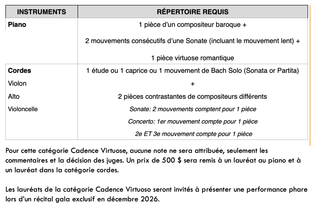 Cadence Virtuose (compétitif) : L’éligibilité est limitée aux anciens lauréats des prix Cadence, CMC et Omni, âgés de 10 ans et plus.